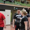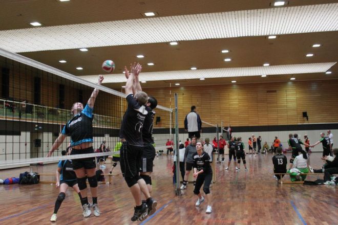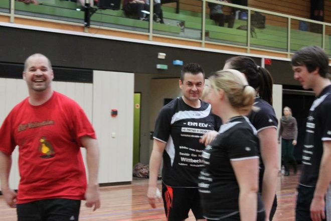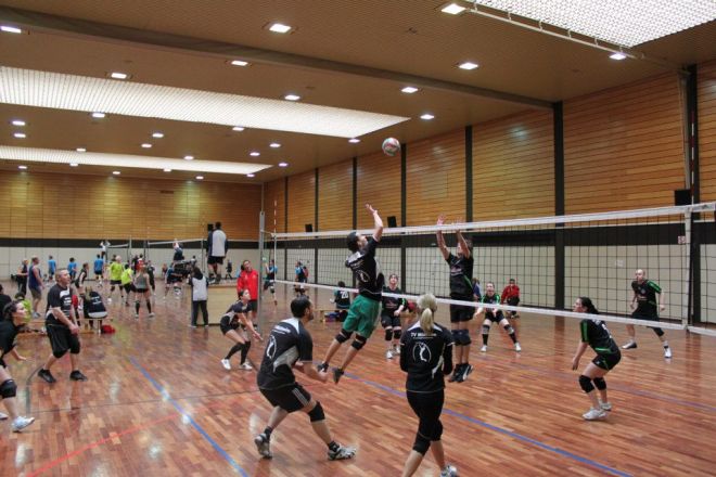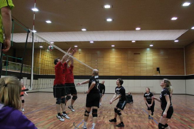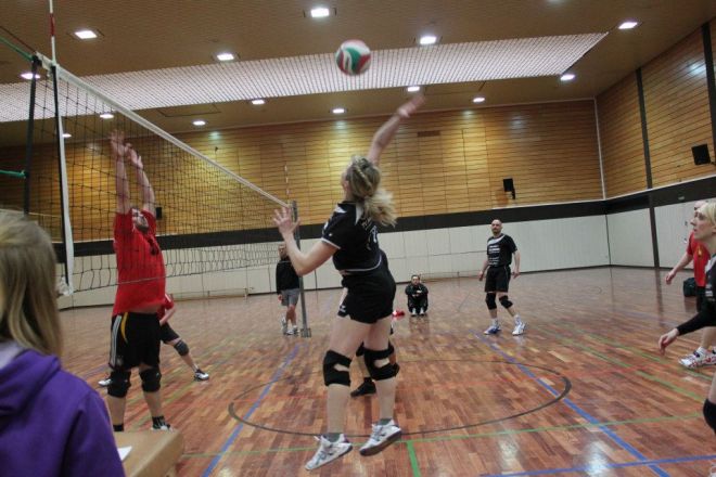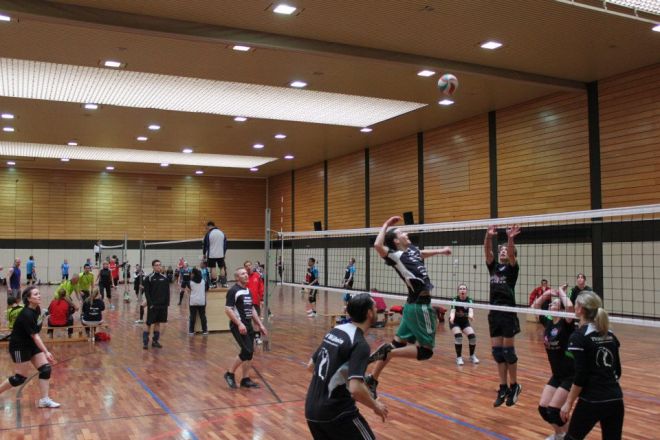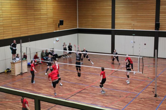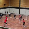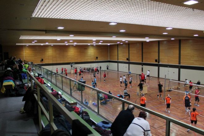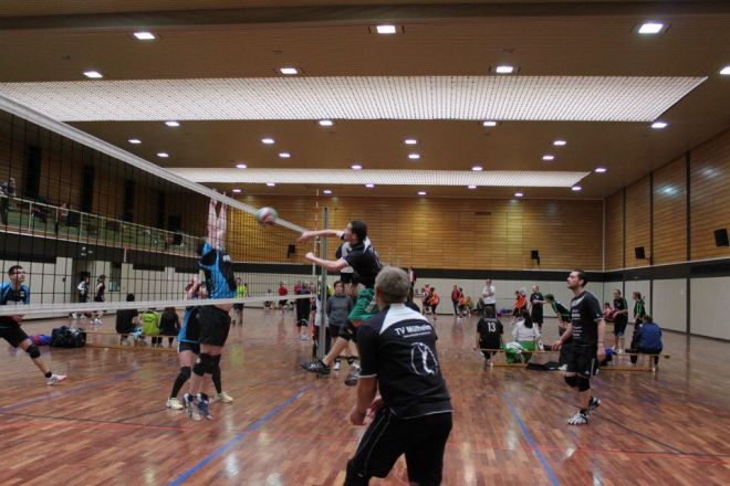 Das Regelwerk sieht vor, das zwei Mannschaften des gleichen Vereins in einer Gruppe das 1. Spiel bestreiten müssen, somit kam zum direkten Vereinsduell. Ein aufeinandertreffen bei vorherigen Turnieren hatte bereits gezeigt, dass hier andere Regeln gelten, als die Mannschaftsbezeichnungen vermuten lassen. Doch der TVM 3 begann nervös und dadurch gewann der TVM 2 den 1.Satz recht deutlich mit 19:12. Der nächste Satz verlief wesentlich ausgeglichener, doch auch hier der TVM 2 knapp mit 16:14.